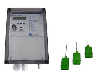 Niveausteuerung durch Staudruckverfahren mit 10 m Luftschlauch oder durch Schwimmerschalter mit 10 m Anschlusskabel